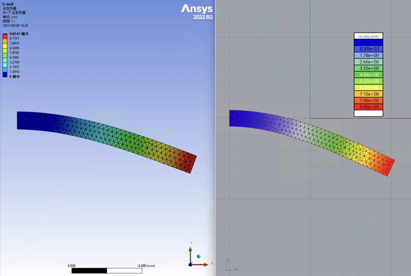 Karamba3dのShell要素は1次要素に分類されるもので、結果を見るとAnsysの1次要素と同程度の精度を持っていましたが、2次要素程の精度はない事がわかりました。