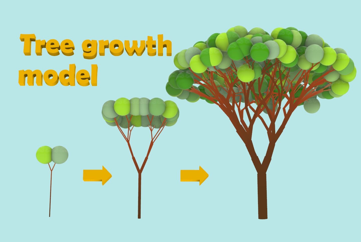 吉澤ら[3]は、伸長指向と葉面積拡張指向の2つの分枝モデルを組み合わせるとともに、群生による樹木同士の成長における相互作用を検証しました。