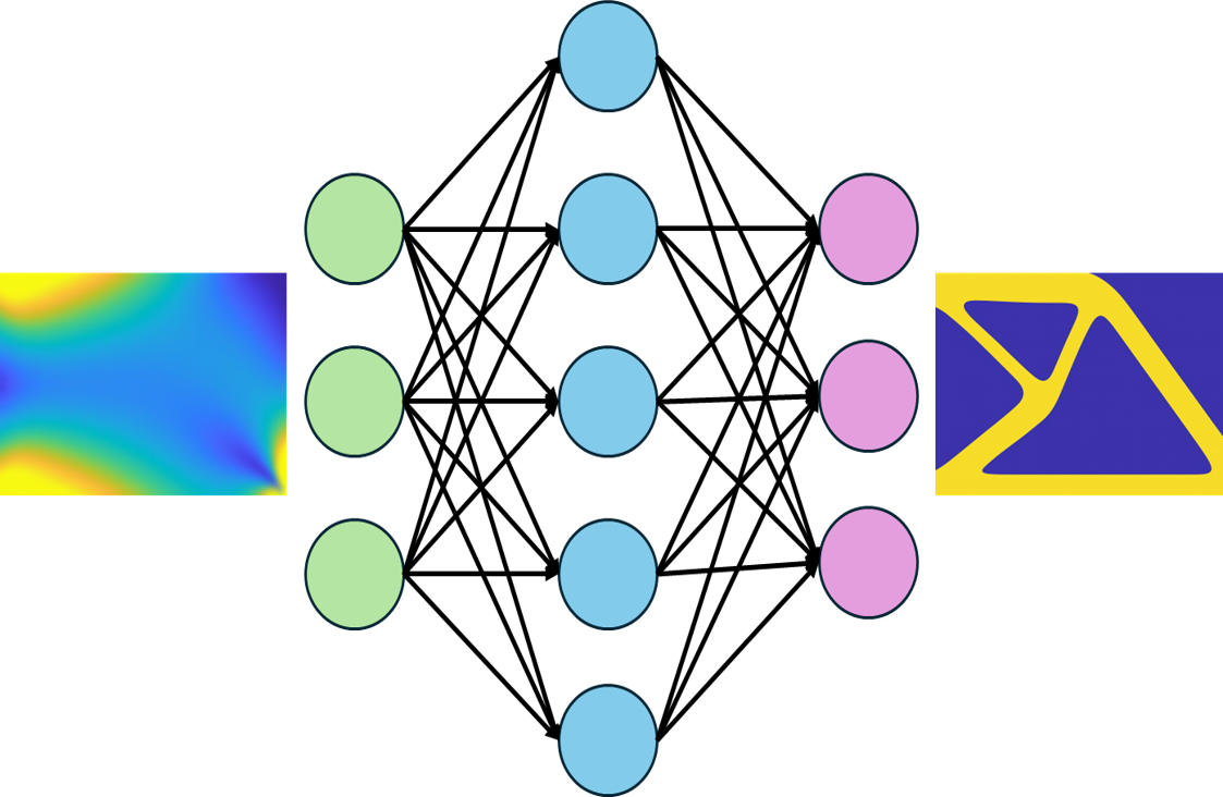 ユーザーは、学習済のモデルに所望の問題設定における初期物理場を入力すれば、それが未学習の問題であっても瞬時に最適幾何形状に近しい材料分布を出力することができます。