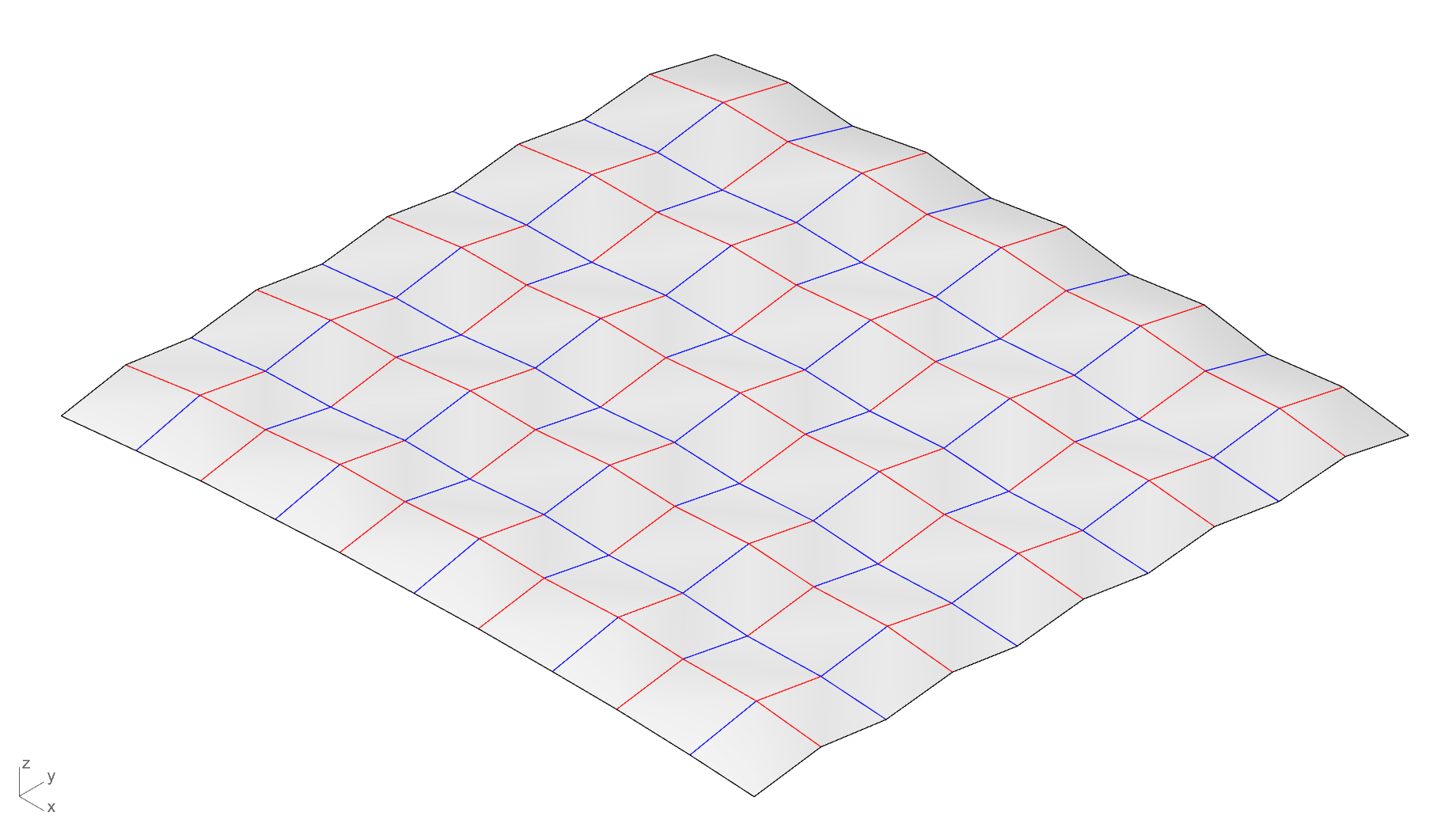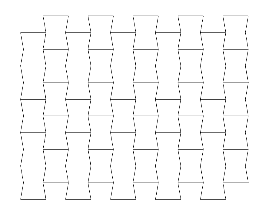 ミウラ折りを動画5に示します。動画5に示すように、ミウラ折りは一枚のシートにジグザグの折り線をつける折りパターンです。XY方向に展開または折り畳まれるため、Auxetic構造の一種と捉えることができます。