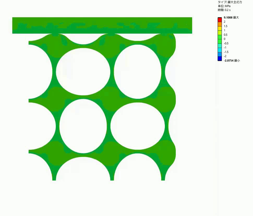 実験結果と数値シミュレーション結果を重ね合わせた動画を動画6に示します。おおまかではありますが、実験における上板の位置と数値シミュレーションにおける壁の位置を一致させ、再生速度を現実の5倍速で揃えています。また、最大主応力を可視化した結果を動画7に示します。
